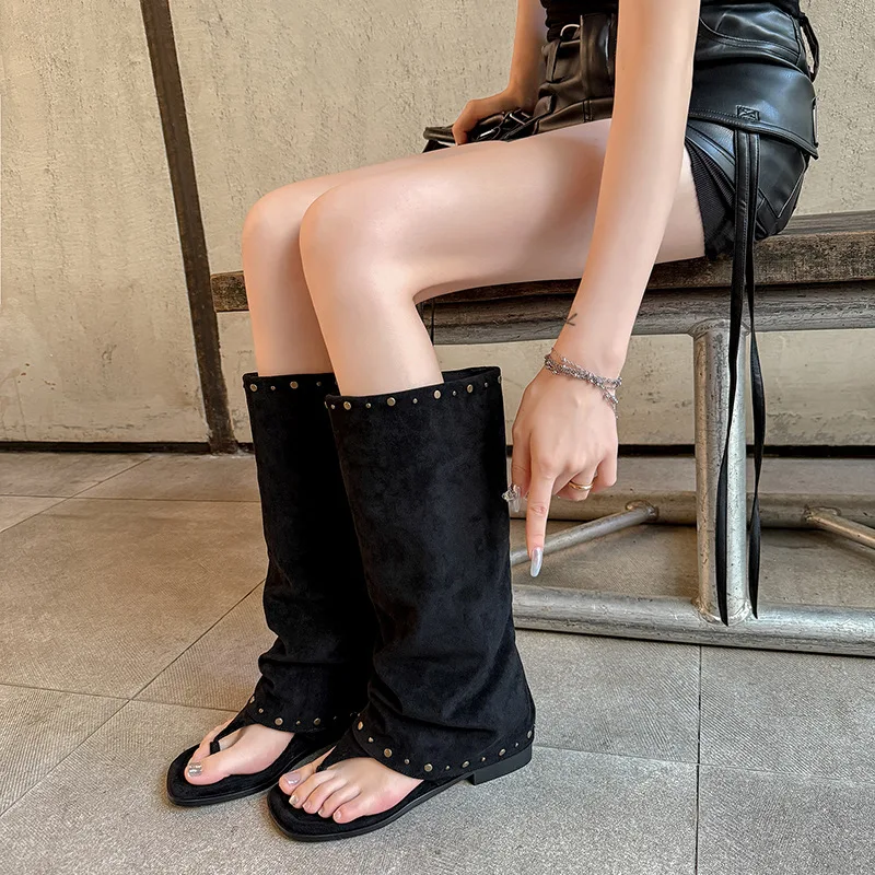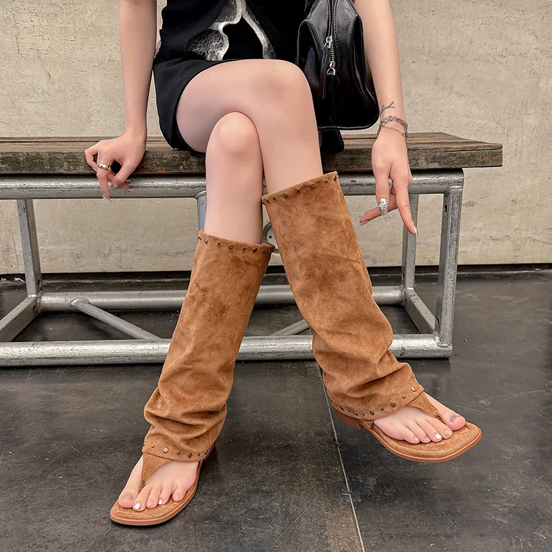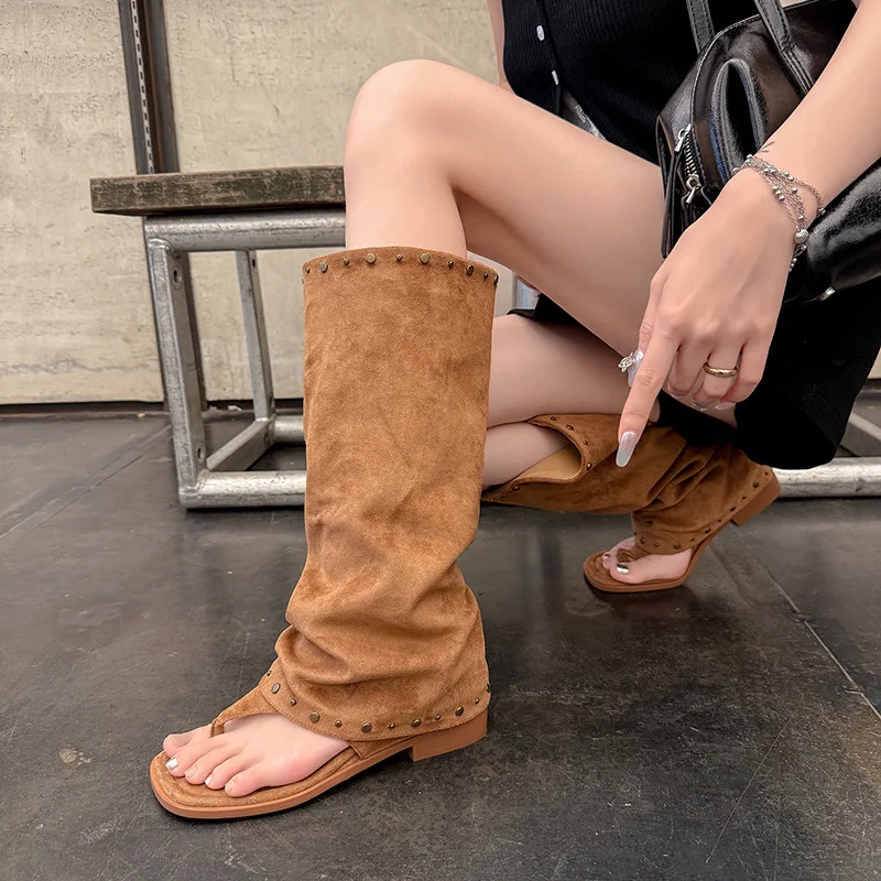 BUSY GIRL MY9801 Women's Suede Knee High Thong Sandals Boots with Rivets Retro Style Slouchy Flat Boots for Summer Autumn